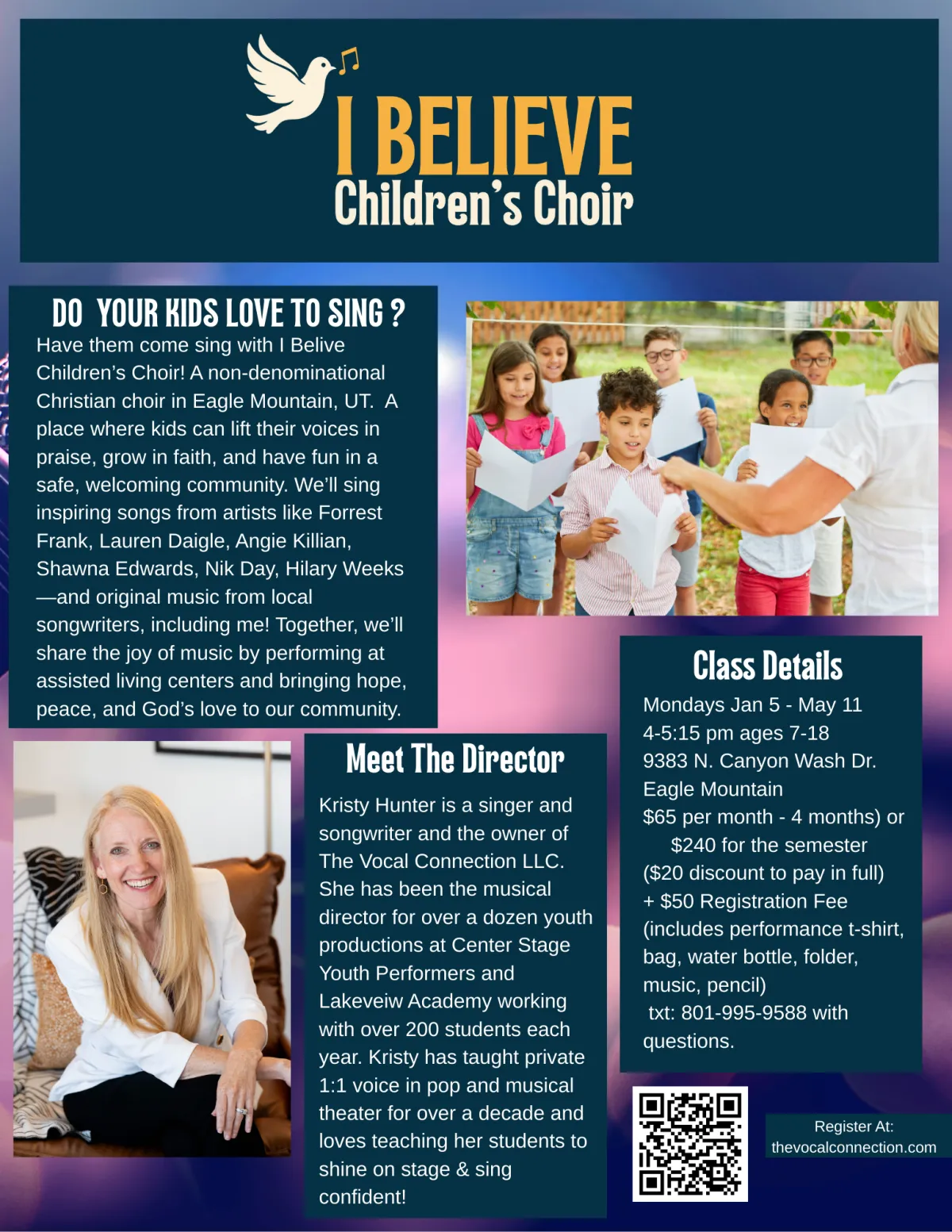 I am the creator of The Vocal Connection LLC in Eagle Mountain, UT. I teach private and group session in-person and virtually. I have been the Musical Director for over 19 youth theater productions at local elementary schools and with Center Stage Youth Performers. Each year I work with over 200 kids on show productions. Audition Coaching is one of my specialties. Many of my students are successful with their auditions and are cast in lead roles and many audition only programs. All of my students gain confidence and belief in themselves as their abilities grow.